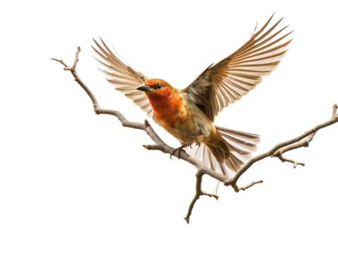 Flat design robin style bird on branch with blossoms, transparent illustration