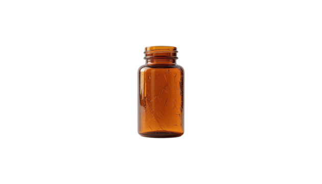 A brown bottle with an open top sits centered against a stark black background in a studio setting