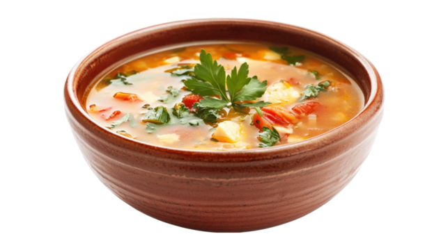Gourmet soup in brown bowl isolated on a transparent background
