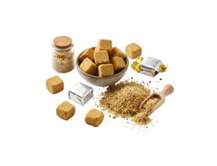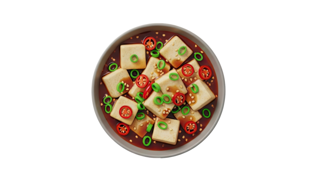 Vibrant brown broth soup with tofu and scallions on transparent background