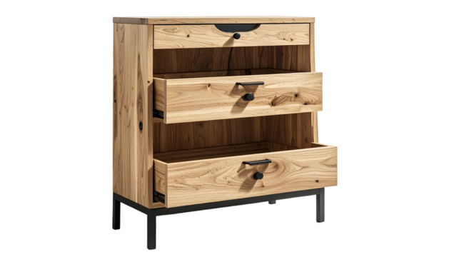 Wooden cabinet with three drawers, partially open, on black metal legs. Neutral backdrop