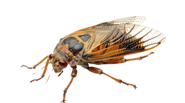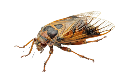 Close-up of cicada insect with detailed wings and body texture isolated on white background