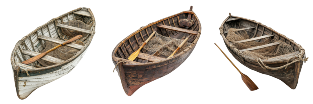 A Set of Aged Fishing Boats Equipped with Nets and Wooden Oars Isolated on Transparent Background