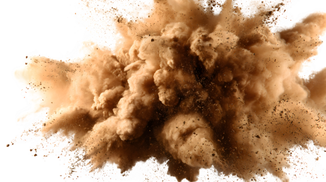 A dramatic burst of brown and beige dust, like a powerful explosion or a kick-up of earth