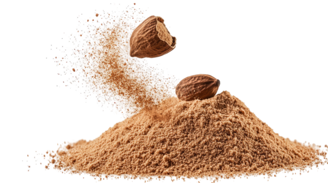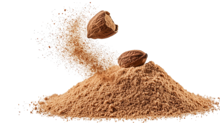 Ground milled nutmeg powder flying in air showing aromatic brown spice with fine texture and natural ingredient detail isolated on white background