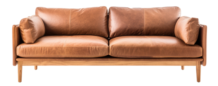 Modern Light Brown Leather Sofa with Wooden Legs on transparent background