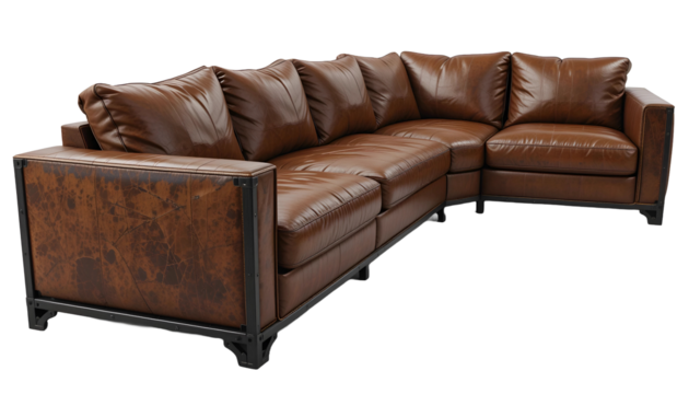 Industrial Style Brown Leather Sectional Sofa with Metal Frame Isolated on Transparent Background
