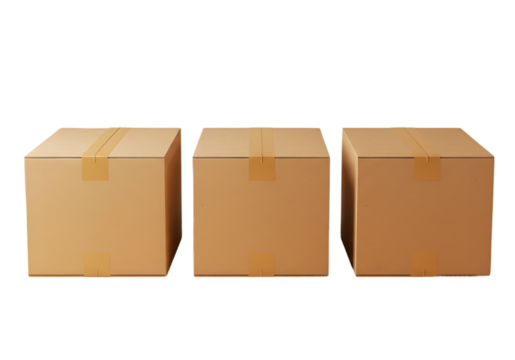 Three cardboard boxes package delivery shipping storage container product brown cube square tape isolated