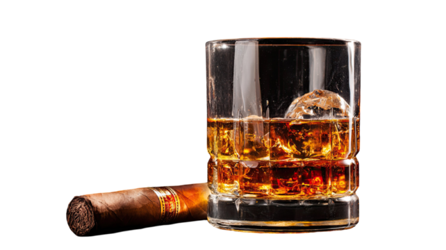 A glass of cold scotch whiskey on the rocks is an isolated luxury brown alcoholic beverage