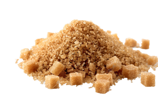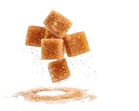Brown Sugar flying explosion, brown grain sugar explode abstract cloud fly. Beautiful complete seed sugarcane splash in air, food object design. Selective focus freeze shot white background isolated