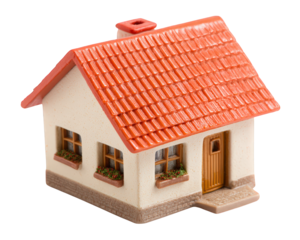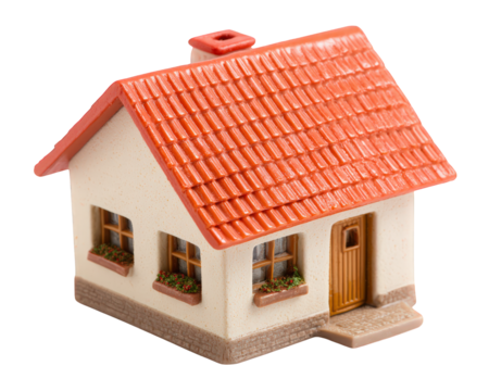 Miniature house model with red roof white wall brown door and window flower boxes isolated on transparency background symbolizing home real estate and cozy living