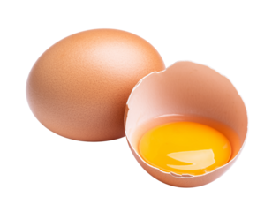Cracked brown egg with intact yolk and broken shell in high detail, isolated on white transparent background