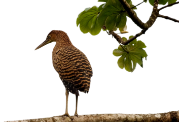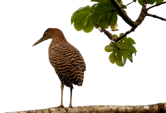 Bare-throated Tiger Heron (Tigrisoma mexicanum) perched on tree branch with green leaves, Costa Rica