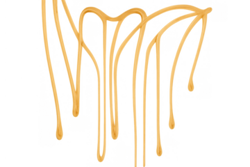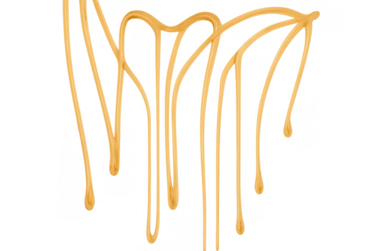 Caramel sauce swirling, golden liquid dessert topping with sweet drips and a sticky texture, transparent background