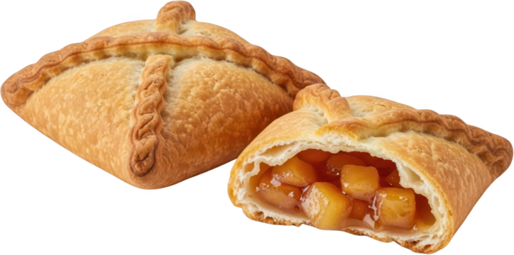 Two golden brown pastries one whole and one halved revealing a sweet apple filling with visible fruit chunks and syrupy glaze pastry apple pastry baked good transparent background