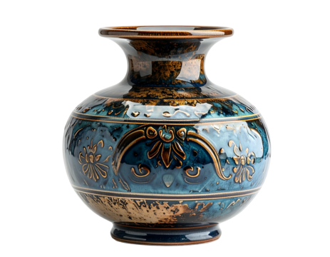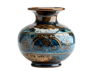 A ceramic vase features a blue and brown glaze with floral relief detailing. It stands against a dark background, highlighted