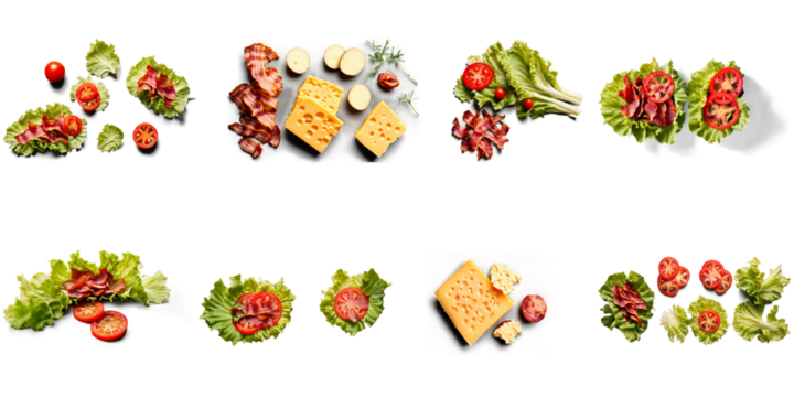 transparent mockup image of Bacon, Lettuce, Tomato, Potato, Cheddar, Bacon done in a realistic style for a breakfast or snack concept, suitable for a food and cooking theme, transparent background
