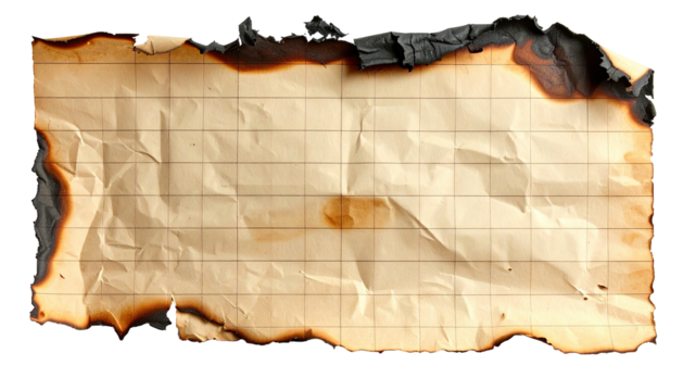 Burned parchment-like paper with grid lines, crumpled and charred around the edges