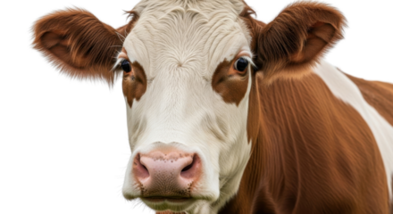 Close up of a brown and white dairy cow head isolated PNG with Transparent Background