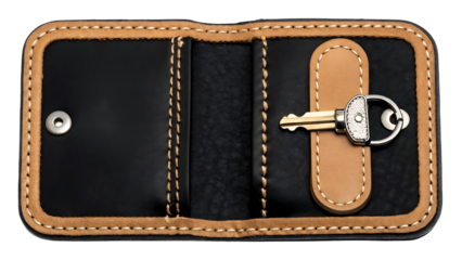Brown leather key case with silver stripes, white stitching, cut out transparent