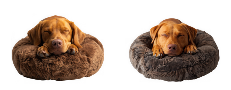 two adorable labrador retrievers peacefully sleeping in cozy round beds showcasing different colors on transparent background high quality