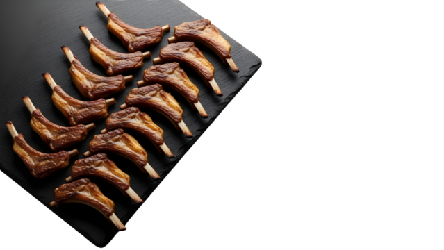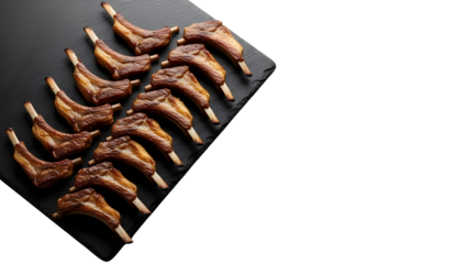 Grilled lamb chops rack on a black slate platter isolated on white background for menu design.