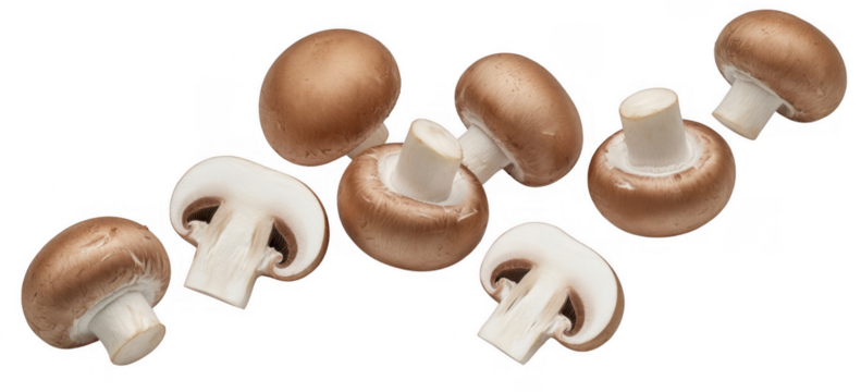 Crimini mushrooms isolated PNG, brown agaricus bisporus fungi on transparent background, edible ingredient for cooking and healthy eating