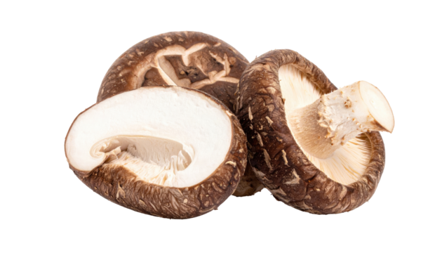 Close-up of three shiitake mushrooms, two whole and one sliced open, displaying a brown cap and a white underside