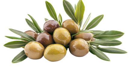 Fresh green and brown olives with leaves on transparent background