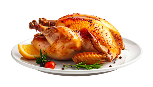 A roasted fowl, glistening and golden, rests on a white plate, adorned with a slice of citrus, herbs, and peppercorns