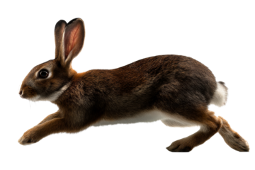 Brown rabbit leaping with energy against a transparent background