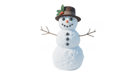 Snowman wearing brown hat and holly winter festive isolated on a transparent background