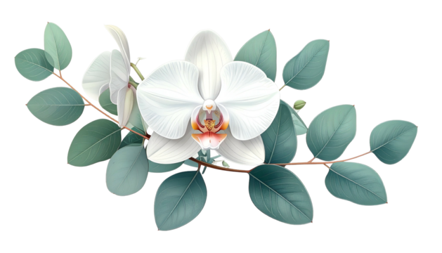Realistic illustration of white orchids with green leaves and a brown stem on black