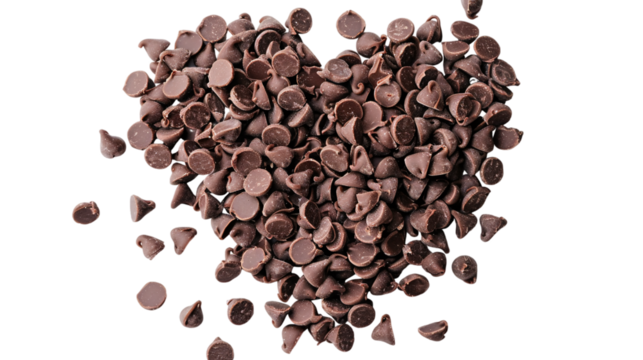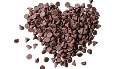 Heart shape created using chocolate chips on white background, heap of chocolate chips