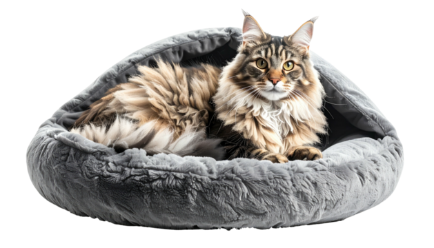Fluffy tabby cat rests in a soft, gray, faux fur hooded bed