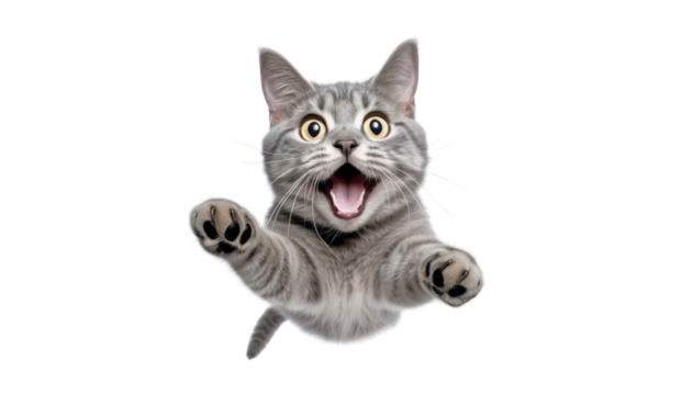A curious orange tabby cat standing on hind legs with paw raised high isolated on transparent background