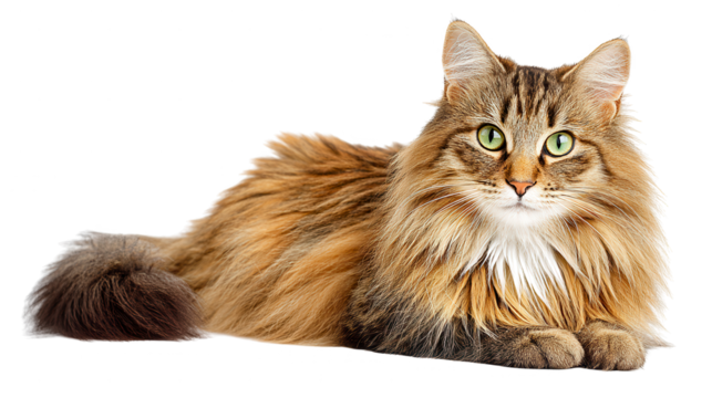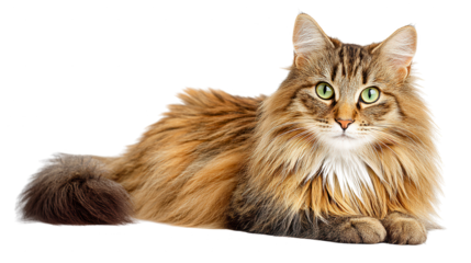 A young cream-colored tabby cat, fluffy fur, golden-green eyes, pink nose, whiskers, lying on back, paws extended, head tilted, looking at camera, transparent studio background, ultra