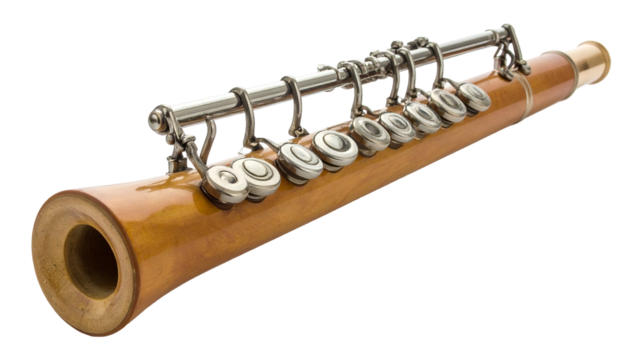 Wooden clarinet with metal mouthpiece isolated on transparent background, perfect for music and instrument concepts