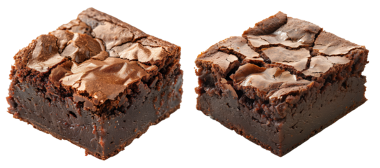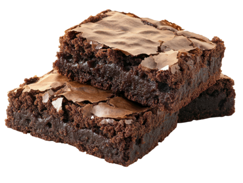 Three rich chocolate brownies with moist, gooey texture on transparent background.