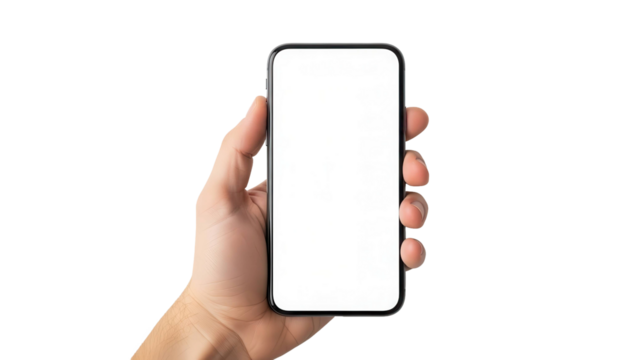 Blank smartphone screen held by hand, minimalist design, transparent background for easy editing and graphic integration