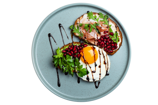 Sandwiches with jamon and fried egg on a plate decorated with herbs and sprinkled with pomegranate seeds on isolated png background top view