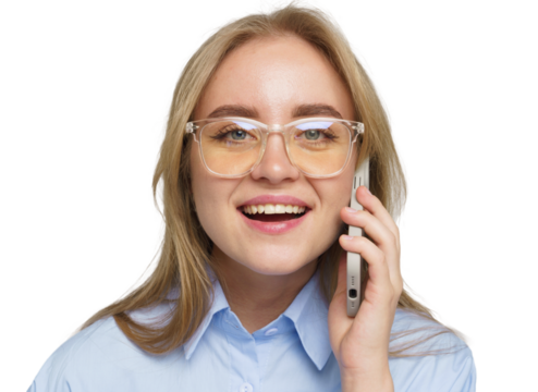 Smiling Young Person in Glasses Chatting on the Phone in a Bright, Cheerful Setting