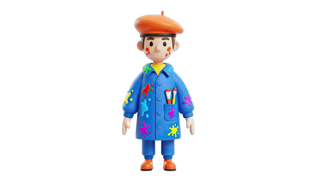 Cartoon girl painting on an easel with a focused expression showing concentration creativity and playful childhood imagination isolated on transparent background PNG