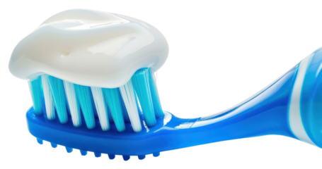 Close up of toothpaste on a toothbrush on transparent and white background, cut out png