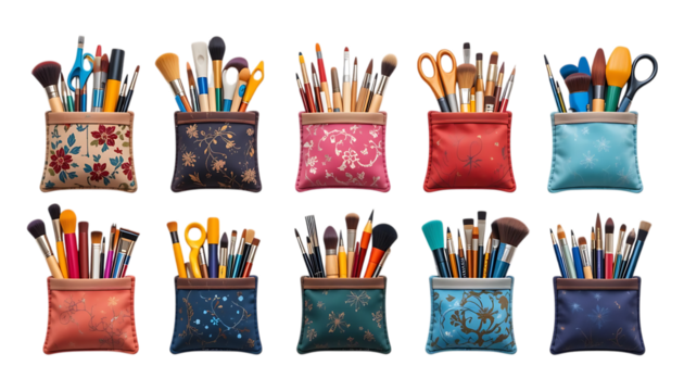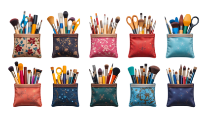 Whimsical Dance of Makeup Brushes. On White or PNG Transparent Background..
