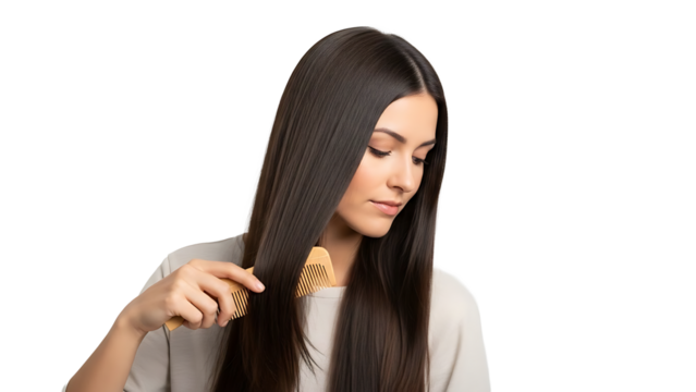 Blonde hair with rose gold brush on black. She is brushing her hair. Beauty product staging, advertising.