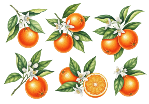 Multiple exquisite watercolor illustrations of orange branches, ripe citrus fruits, green leaves, white blossoms, and a juicy half-slice, on a transparent background with copy space. Concept of
