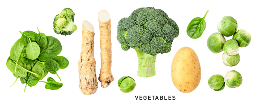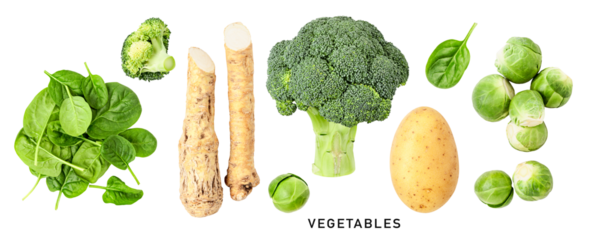 Potato spinach broccoli brussel sprouts horseradish isolated. Flat lay, top view. PNG with transparent background. Without shadow