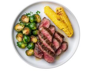 Grilled steak with brussel sprouts and corn isolated on transparent background, delicious meal