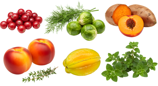 Fresh assorted fruits and herbs including cranberries, brussels sprouts, apricots, peaches, starfruit, thyme, and mint, perfect for healthy cooking and garnishing